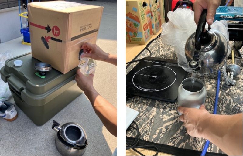 まずは、AIリキッドの原液が入った段ボールから原液をヤカンに小分けします。